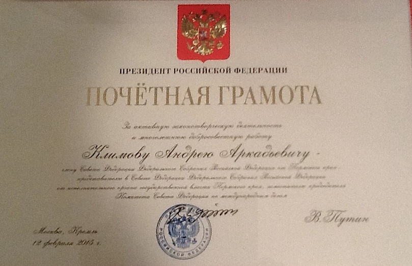 В среду, 25 февраля, сенатор Андрей Климов на очередном пленарном заседании Совета Федерации был награжден почетной грамотой Президента Российской Федерации за активную законотворческую деятельность и многолетнюю добросовестную работу.