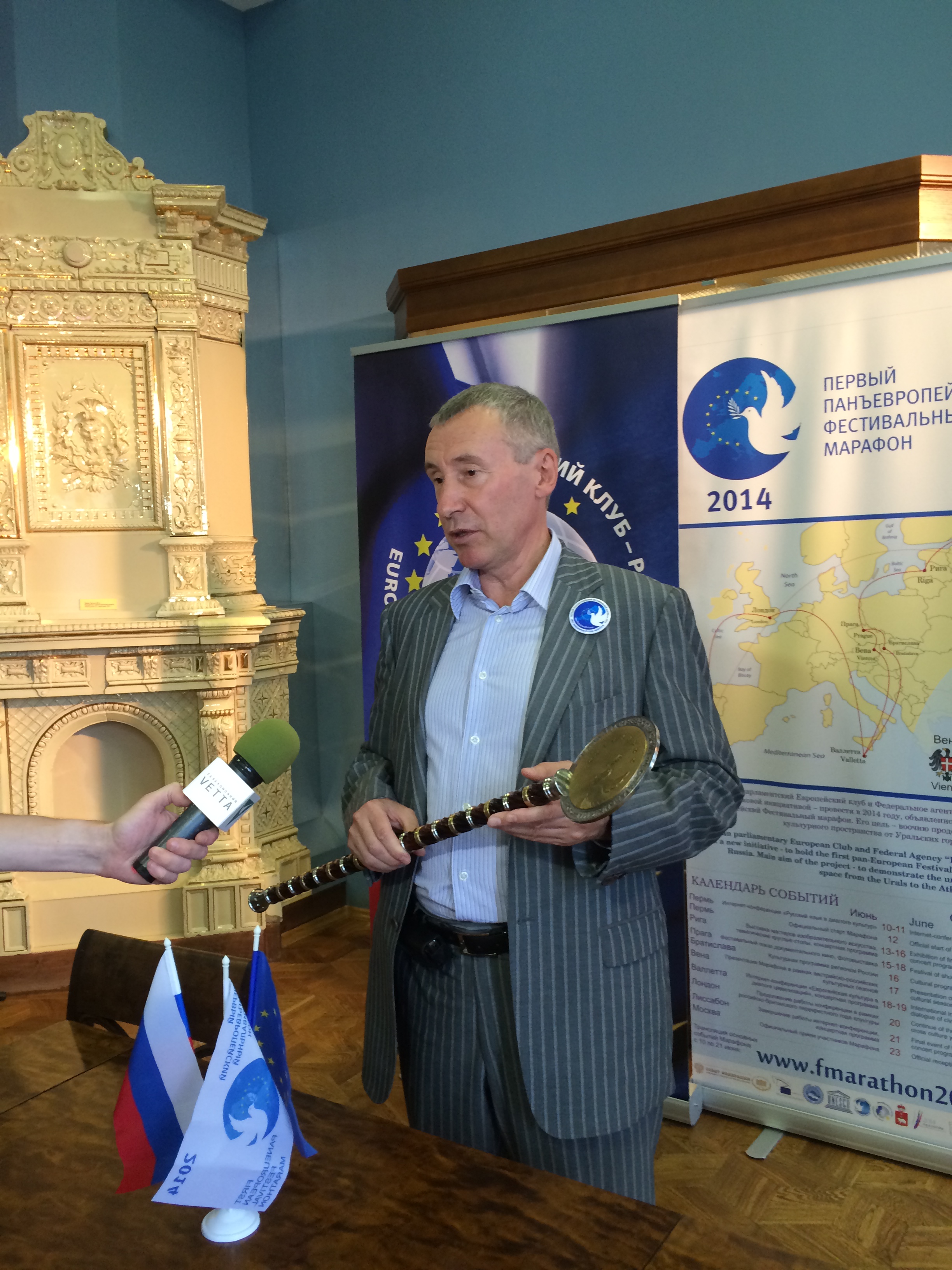 4 июля в Пермском краевом музее был торжественно принят новый ценный экспонат - жезл первого панъевропейского Фестивального марафона от Урала до Атлантики. В церемонии принял участие руководитель проекта Фестивального марафона, сенатор А. Климов.