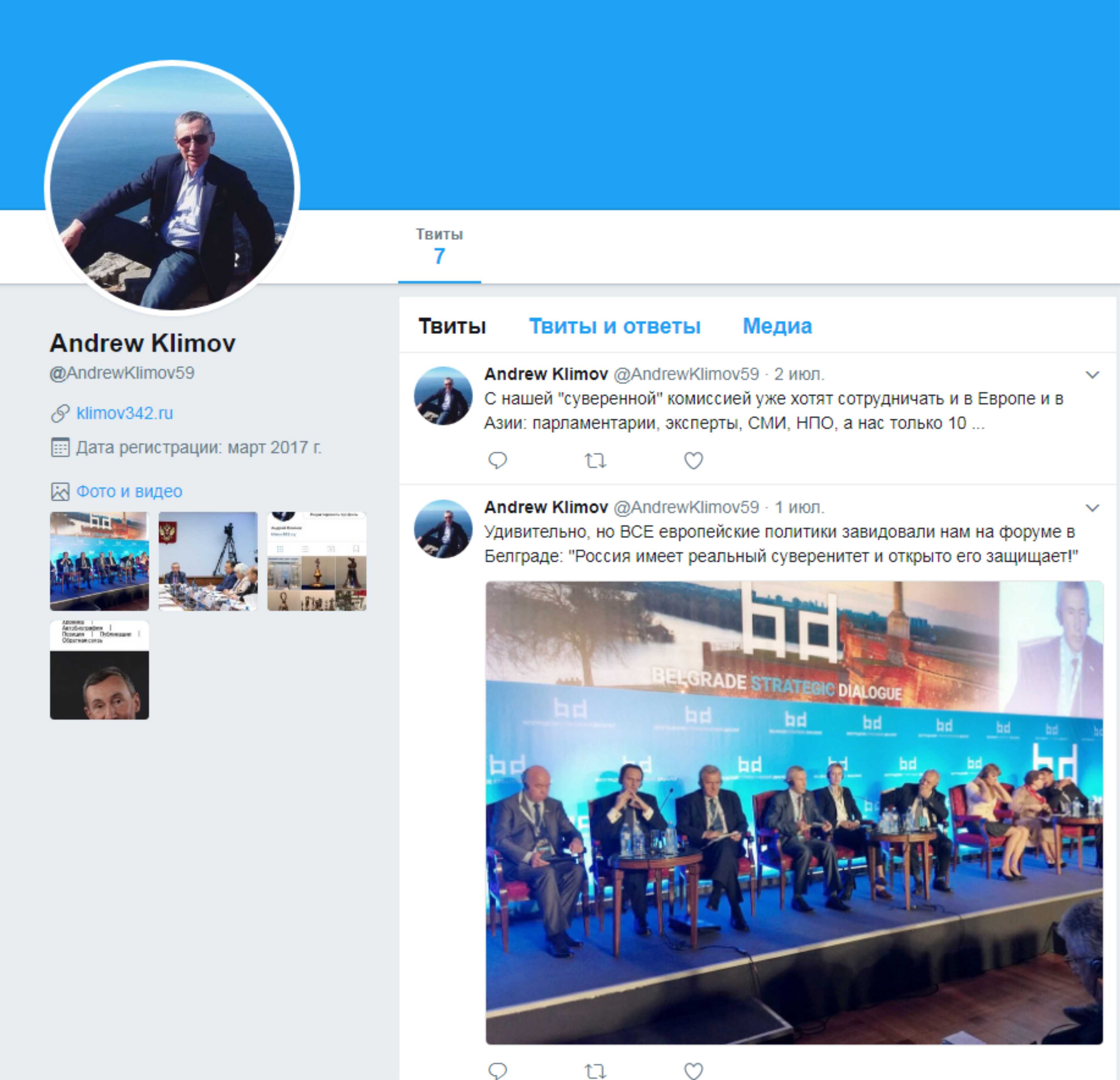 В связи с созданием 14 июня сенаторской комиссии по защите государственного суверенитета РФ Председатель Комиссии Андрей Климов вновь запустил свою страничку в Твиттере - https://twitter.com/AndrewKlimov59